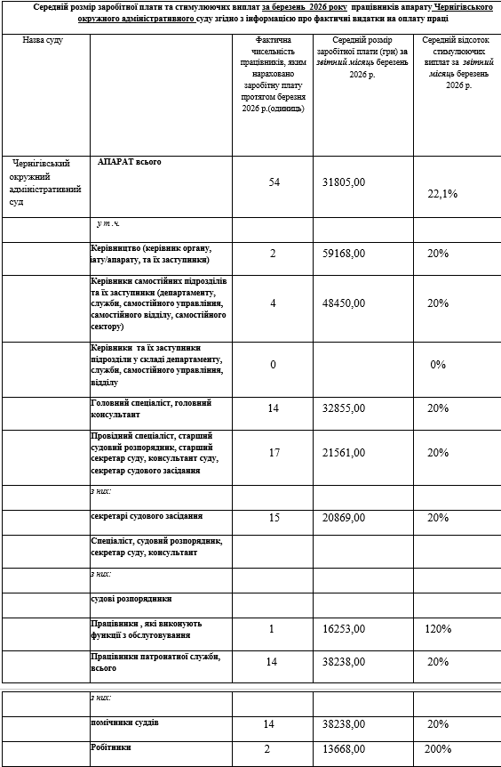 Середній розмір заробітної плати та стимулюючих виплат за березень 2026 року працівників апарату Чернігівського окружного адміністративного суду згідно з інформацією про фактичні видатки на оплату праці